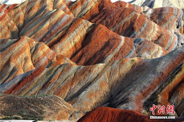甘肃省张掖市张掖七彩丹霞地貌奇观,是国内唯一的丹霞地貌与彩色丘陵景观复合区,现为国家地质公园。图/中新网 刘兆明
