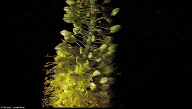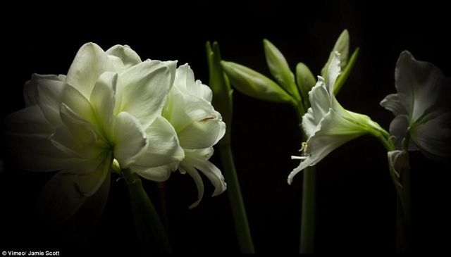这段视频的制作者是视觉特效师Jamie Scott,他在夜里,拍摄了花开瞬间。他拍摄的花朵包括了水仙、风信子以及樱花等等。